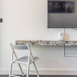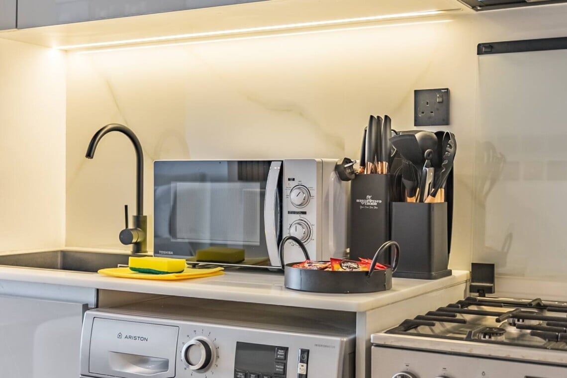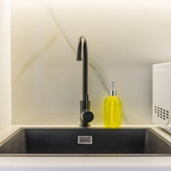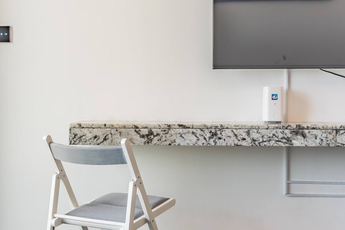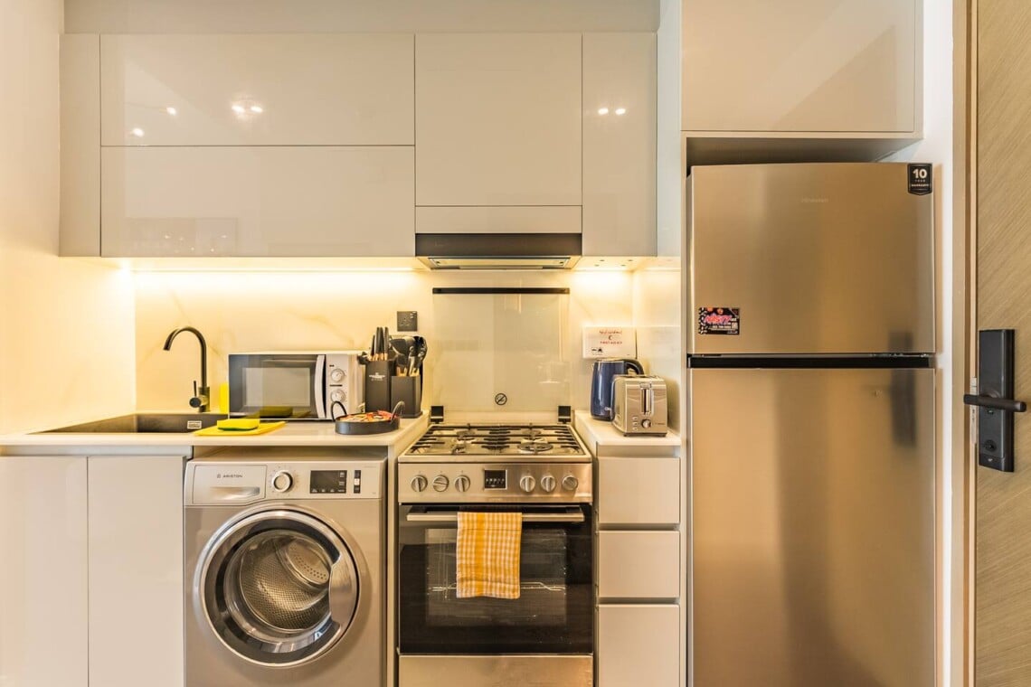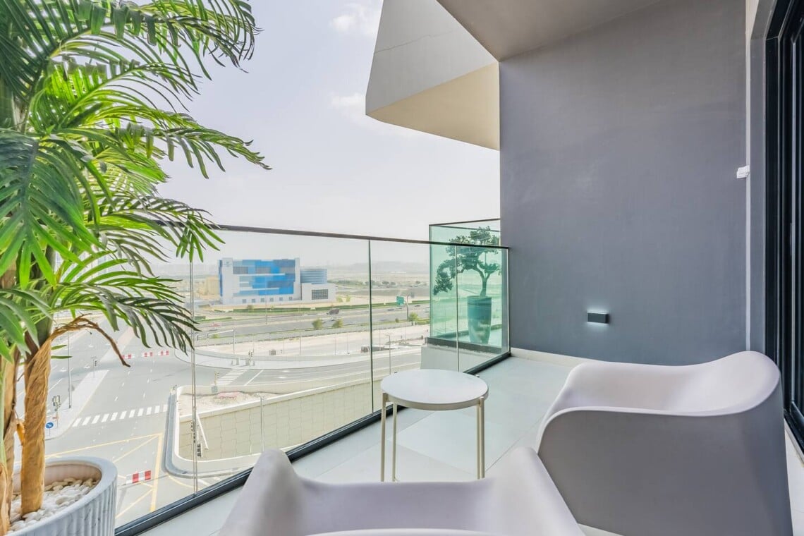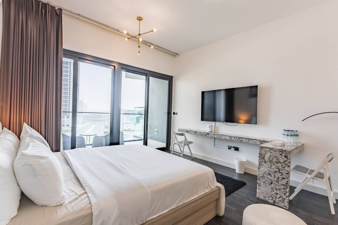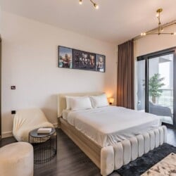 Spacious & Stylish: This 42 sqm studio is designed for comfort and accommodates up to two guests. Modern & Elegant Interiors: Thoughtfully furnished with contemporary décor, premium amenities, and stunning community views. Features at a Glance: ✔ 1 King-Size Bed with premium bedding for ultimate comfort. ✔ Cozy Living Area with Smart TV and a coffee table. ✔ Fully Equipped Kitchen with modern appliances for all your culinary needs. ✔ Spacious Balcony with seating offering serene community views. ✔ High-speed Wi-Fi to keep you connected throughout your stay. ✔ Free On-Site Parking for added convenience. The Living Space: ✔ Plush beige single sofa for added comfort ✔ Coffee Table ✔ HD Smart TV for entertainment Sleeping Arrangements: The bedroom offers serene, comfortable surroundings with premium bedding and thoughtful touches, ensuring a restful night’s sleep. Bedroom: King-size bed (180 cm x 200 cm) Accommodates up to 2 guests. The bedroom is equipped with: ✔ Premium Mattresses, Linens, Sheets, and Pillows ✔ Dressers with Spacious Drawers & Hangers ✔ Blackout Curtains ✔ Nightstands with Reading Lamps Dining Corner: Elegant marble countertop with two chairs—perfect for dining or working. Private Balcony: Furnished with a table and two chairs, offering tranquil community views—ideal for morning coffee or evening relaxation. Fully Equipped Kitchen: Our warm and practical kitchen serves as the heart of the home, designed to spark your culinary creativity. Fully equipped with all the essentials, it provides a welcoming space to prepare and enjoy delicious meals effortlessly. ✔ Modern white cabinetry with hidden LED lighting ✔ Microwave ✔ Coffee & Sugar Essentials ✔ Cooker ✔ Oven ✔ Toaster ✔ Kettle ✔ Refrigerator ✔ Sink ✔ Plates ✔ Glasses ✔ Pots & Pans & Cooking Utensils ✔ Washing Machine Sleek Bathroom: ✔ Stylish, black-tiled design with a walk-in shower, toilet, and well-lit vanity with a mirror. ✔ Complimentary essentials include fresh towels, shampoo, conditioner, soap, and a hairdryer for your convenience. Convenience & Safety: In-unit amenities: ✔ Washing machine ✔ Iron and ironing board ✔ Safe Deposit Box ✔ Room-darkening shades Safety features: ✔ Carbon monoxide alarm ✔ Smoke detector ✔ Fire extinguisher ✔ First-aid kitNotes