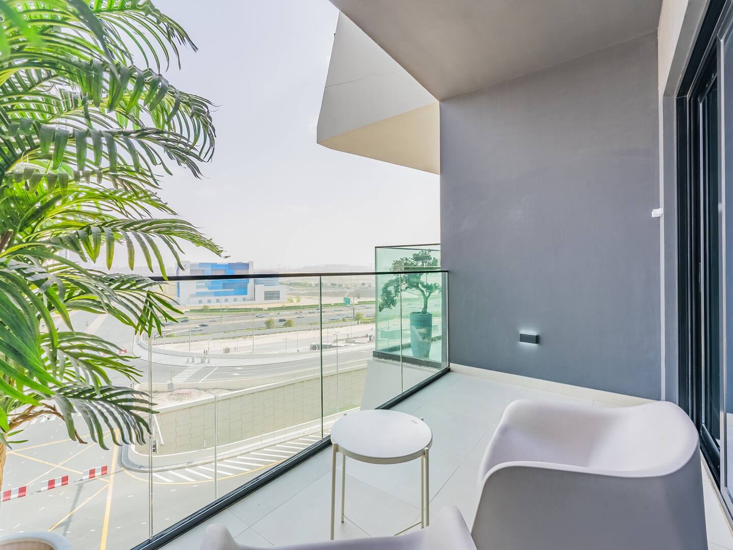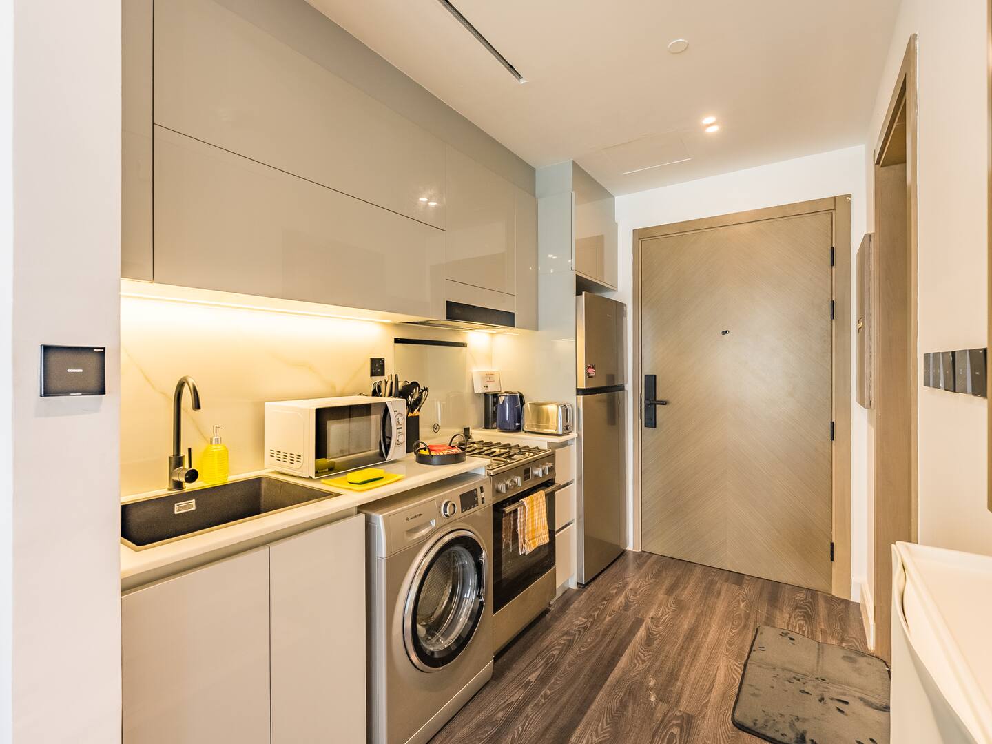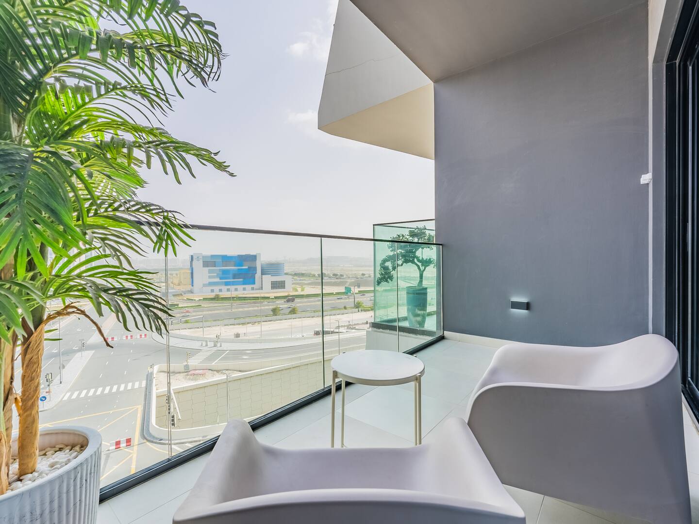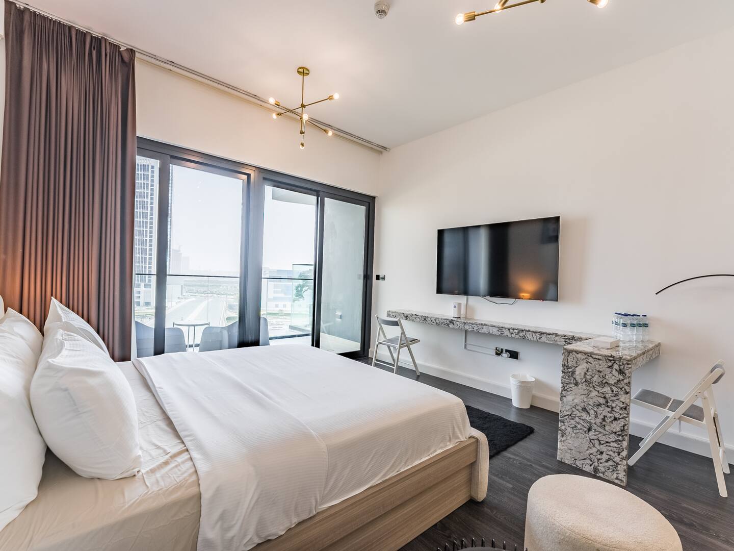 Spacious & Stylish: This 42 sqm studio is designed for comfort and accommodates up to two guests. Modern & Elegant Interiors: Thoughtfully furnished with contemporary décor, premium amenities, and stunning community views. Features at a Glance: ✔ 1 King-Size Bed with premium bedding for ultimate comfort. ✔ Cozy Living Area with Smart TV and a coffee table. ✔ Fully Equipped Kitchen with modern appliances for all your culinary needs. ✔ Spacious Balcony with seating offering serene community views. ✔ High-speed Wi-Fi to keep you connected throughout your stay. ✔ Free On-Site Parking for added convenience. The Living Space: ✔ Plush beige single sofa for added comfort ✔ Coffee Table ✔ HD Smart TV for entertainment Sleeping Arrangements: The bedroom offers serene, comfortable surroundings with premium bedding and thoughtful touches, ensuring a restful night’s sleep. Bedroom: King-size bed (180 cm x 200 cm) Accommodates up to 2 guests. The bedroom is equipped with: ✔ Premium Mattresses, Linens, Sheets, and Pillows ✔ Dressers with Spacious Drawers & Hangers ✔ Blackout Curtains ✔ Nightstands with Reading Lamps Dining Corner: Elegant marble countertop with two chairs—perfect for dining or working. Private Balcony: Furnished with a table and two chairs, offering tranquil community views—ideal for morning coffee or evening relaxation. Fully Equipped Kitchen: Our warm and practical kitchen serves as the heart of the home, designed to spark your culinary creativity. Fully equipped with all the essentials, it provides a welcoming space to prepare and enjoy delicious meals effortlessly. ✔ Modern white cabinetry with hidden LED lighting ✔ Microwave ✔ Coffee & Sugar Essentials ✔ Cooker ✔ Oven ✔ Toaster ✔ Kettle ✔ Refrigerator ✔ Sink ✔ Plates ✔ Glasses ✔ Pots & Pans & Cooking Utensils ✔ Washing Machine Sleek Bathroom: ✔ Stylish, black-tiled design with a walk-in shower, toilet, and well-lit vanity with a mirror. ✔ Complimentary essentials include fresh towels, shampoo, conditioner, soap, and a hairdryer for your convenience. Convenience & Safety: In-unit amenities: ✔ Washing machine ✔ Iron and ironing board ✔ Safe Deposit Box ✔ Room-darkening shades Safety features: ✔ Carbon monoxide alarm ✔ Smoke detector ✔ Fire extinguisher ✔ First-aid kitNotes
