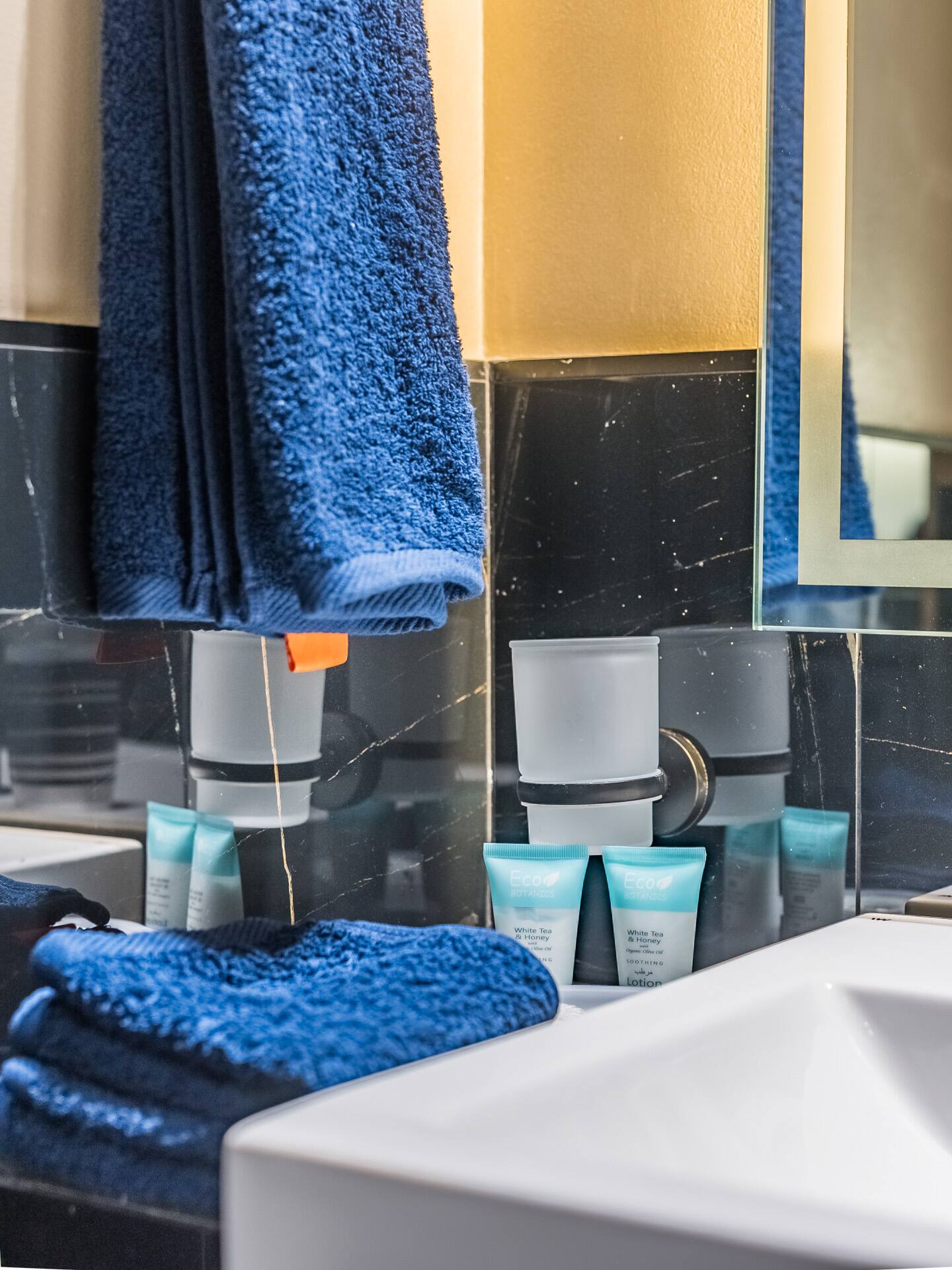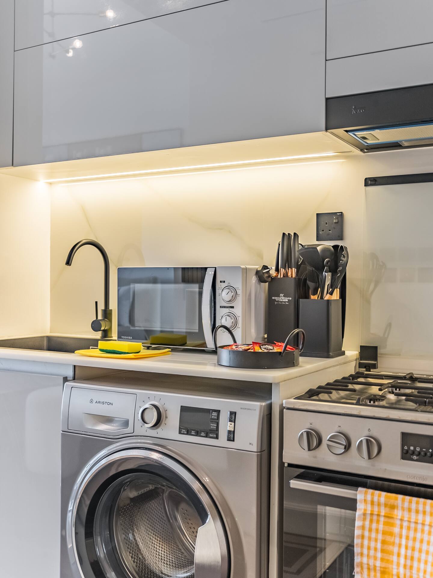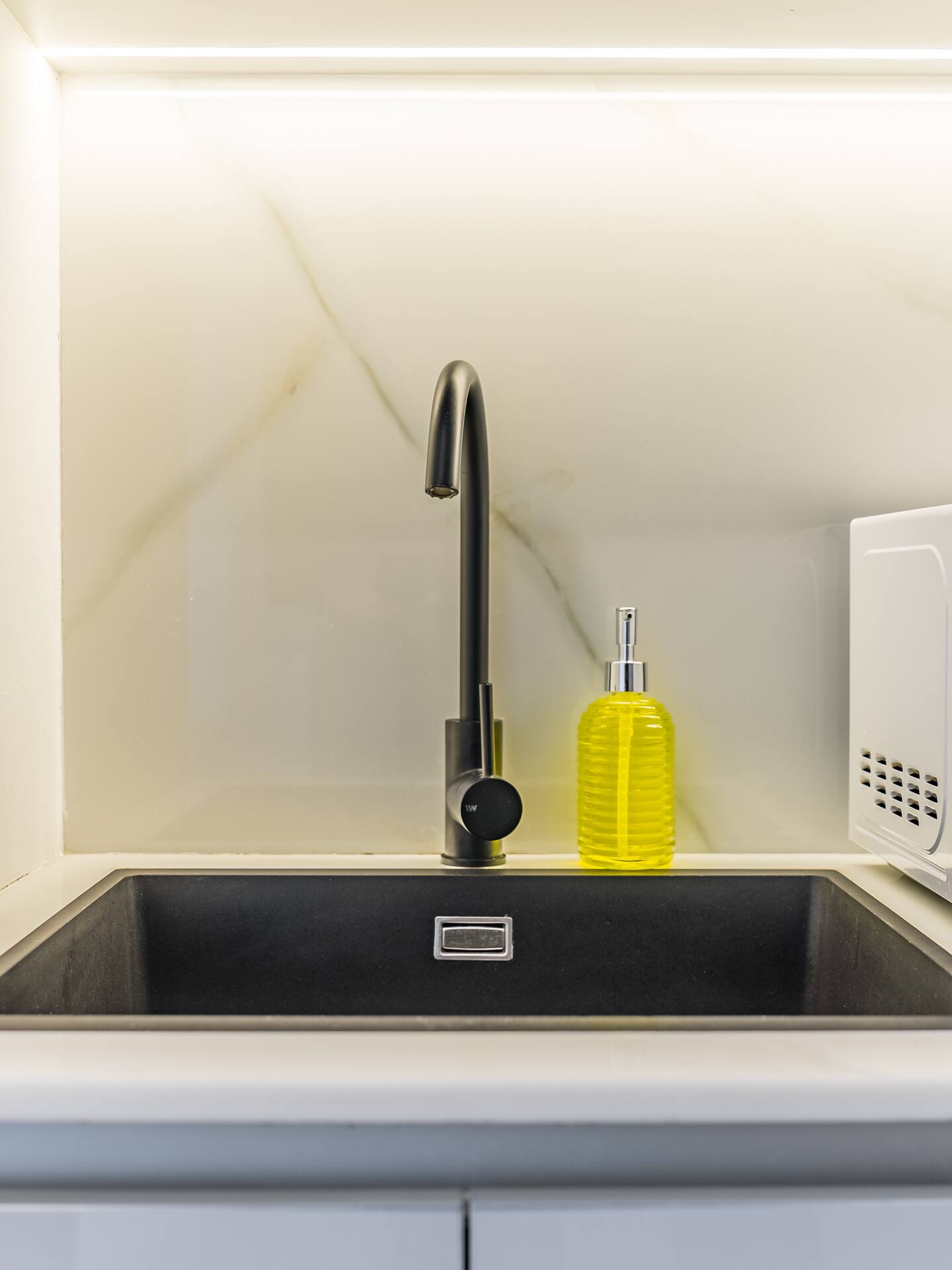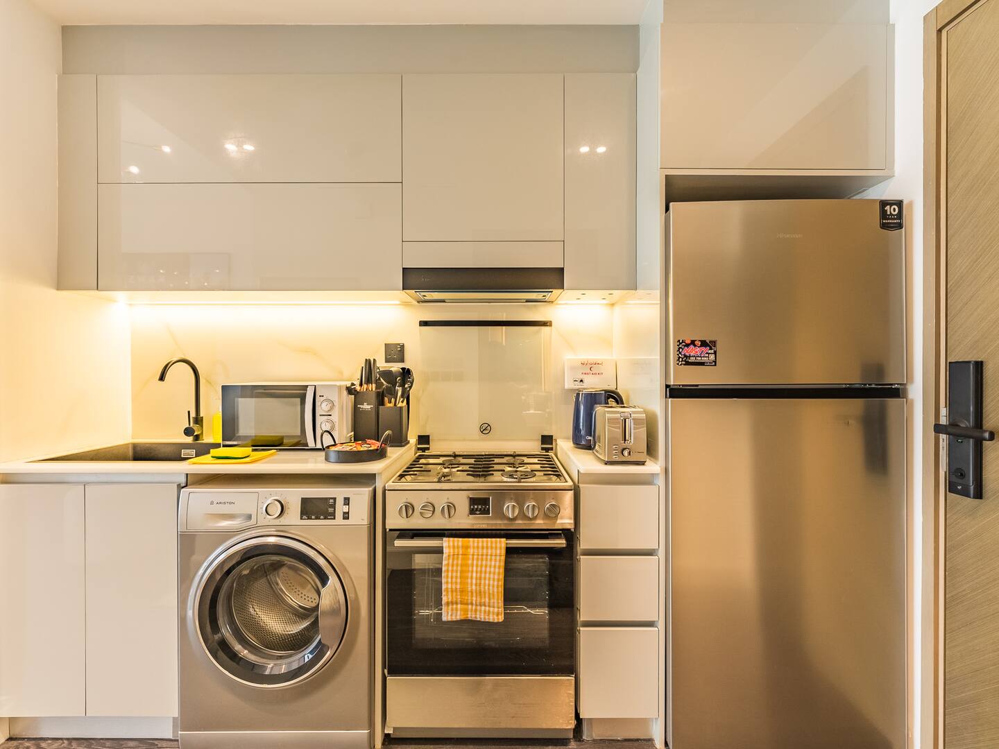 Spacious & Stylish: This 42 sqm studio is designed for comfort and accommodates up to two guests. Modern & Elegant Interiors: Thoughtfully furnished with contemporary décor, premium amenities, and stunning community views. Features at a Glance: ✔ 1 King-Size Bed with premium bedding for ultimate comfort. ✔ Cozy Living Area with Smart TV and a coffee table. ✔ Fully Equipped Kitchen with modern appliances for all your culinary needs. ✔ Spacious Balcony with seating offering serene community views. ✔ High-speed Wi-Fi to keep you connected throughout your stay. ✔ Free On-Site Parking for added convenience. The Living Space: ✔ Plush beige single sofa for added comfort ✔ Coffee Table ✔ HD Smart TV for entertainment Sleeping Arrangements: The bedroom offers serene, comfortable surroundings with premium bedding and thoughtful touches, ensuring a restful night’s sleep. Bedroom: King-size bed (180 cm x 200 cm) Accommodates up to 2 guests. The bedroom is equipped with: ✔ Premium Mattresses, Linens, Sheets, and Pillows ✔ Dressers with Spacious Drawers & Hangers ✔ Blackout Curtains ✔ Nightstands with Reading Lamps Dining Corner: Elegant marble countertop with two chairs—perfect for dining or working. Private Balcony: Furnished with a table and two chairs, offering tranquil community views—ideal for morning coffee or evening relaxation. Fully Equipped Kitchen: Our warm and practical kitchen serves as the heart of the home, designed to spark your culinary creativity. Fully equipped with all the essentials, it provides a welcoming space to prepare and enjoy delicious meals effortlessly. ✔ Modern white cabinetry with hidden LED lighting ✔ Microwave ✔ Coffee & Sugar Essentials ✔ Cooker ✔ Oven ✔ Toaster ✔ Kettle ✔ Refrigerator ✔ Sink ✔ Plates ✔ Glasses ✔ Pots & Pans & Cooking Utensils ✔ Washing Machine Sleek Bathroom: ✔ Stylish, black-tiled design with a walk-in shower, toilet, and well-lit vanity with a mirror. ✔ Complimentary essentials include fresh towels, shampoo, conditioner, soap, and a hairdryer for your convenience. Convenience & Safety: In-unit amenities: ✔ Washing machine ✔ Iron and ironing board ✔ Safe Deposit Box ✔ Room-darkening shades Safety features: ✔ Carbon monoxide alarm ✔ Smoke detector ✔ Fire extinguisher ✔ First-aid kitNotes