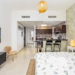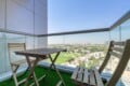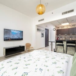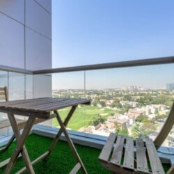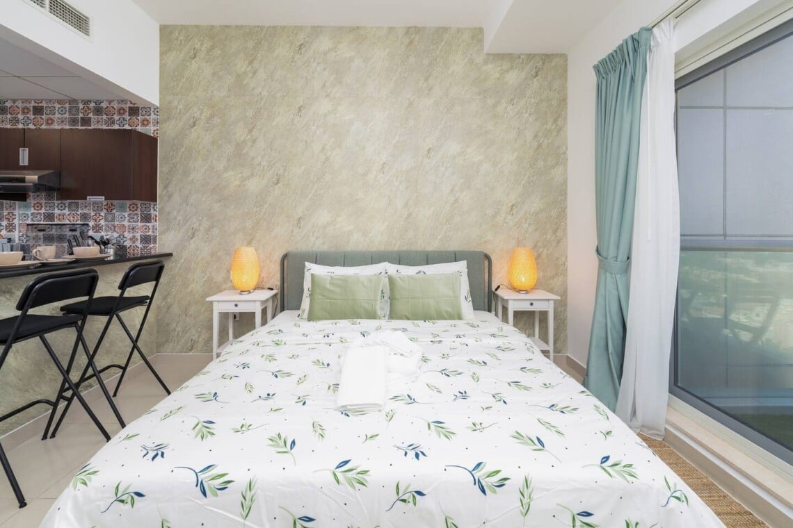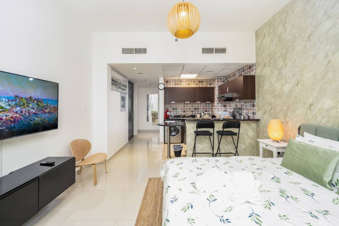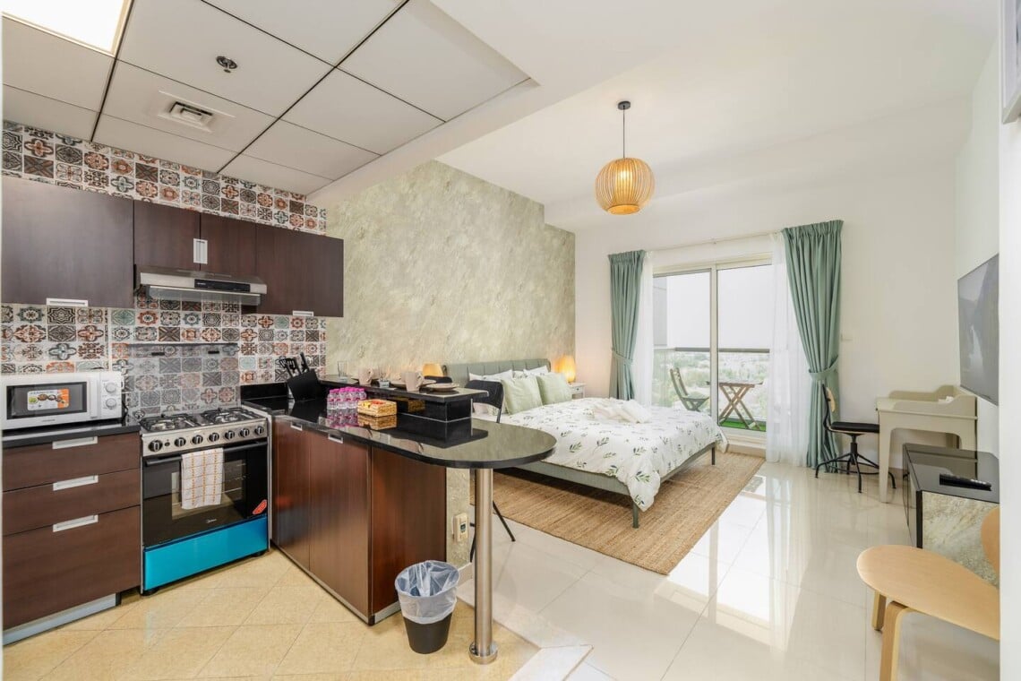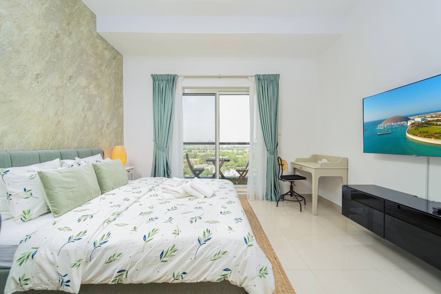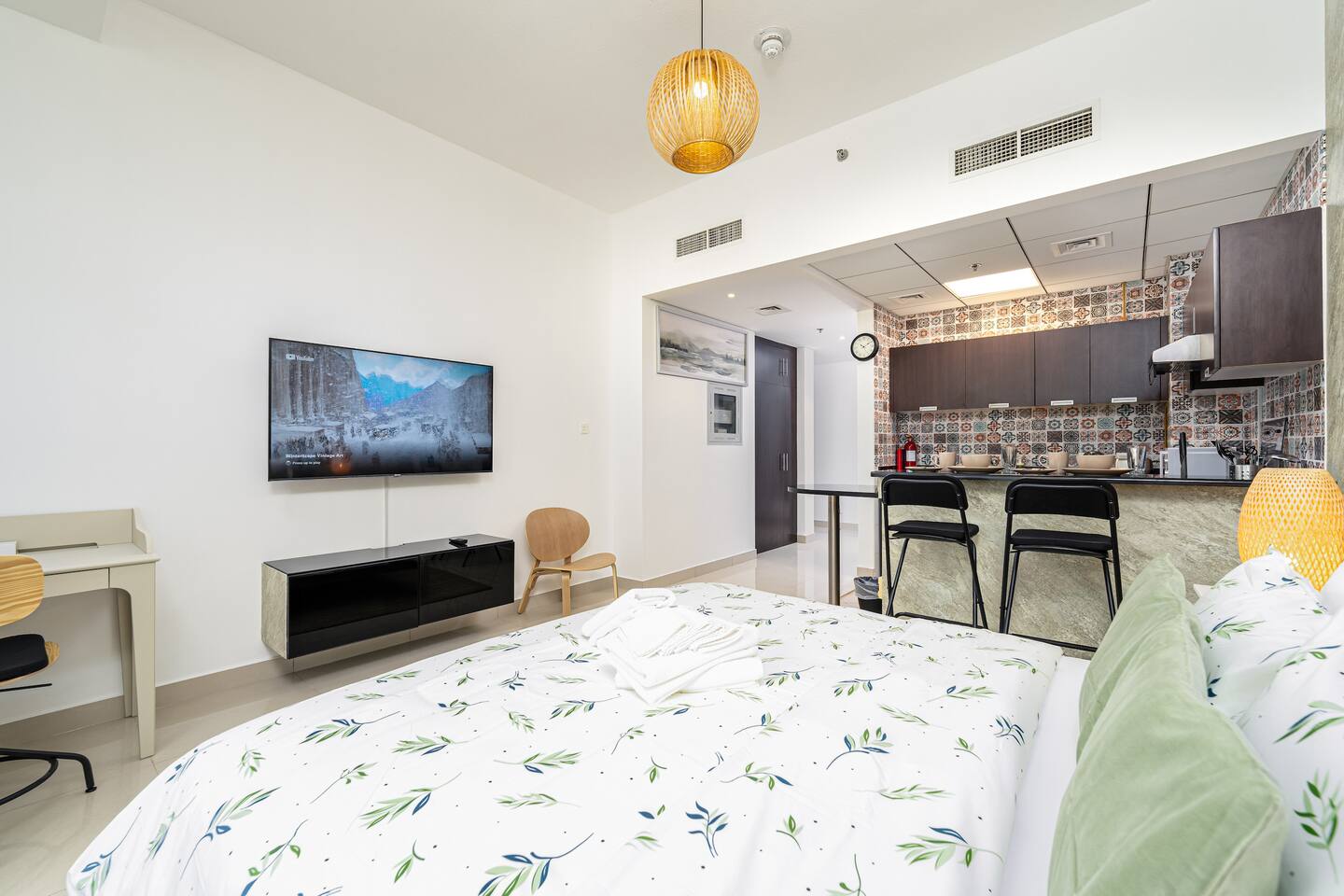 Welcome to your luxurious studio in Dubai Sports City! - 1 King-sized Bed and 1 full bathroom - Elegant furnishings and modern decor with bright interiors - Golf course view from your cozy balcony - Fully equipped kitchen and essential cooking supplies - High-speed Wi-Fi and dedicated working space - Access to rooftop pool, gym, and sauna - Nearby attractions like Dubai International Stadium and Els Club golf course - Complimentary toiletries and free parking on premisesNotes