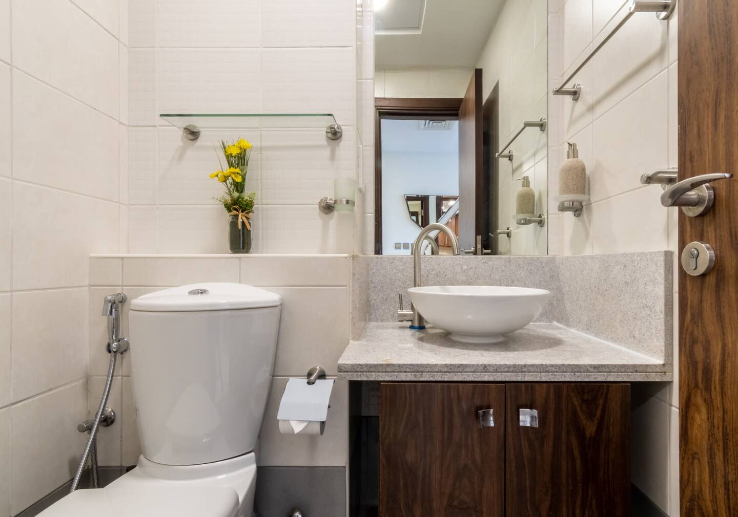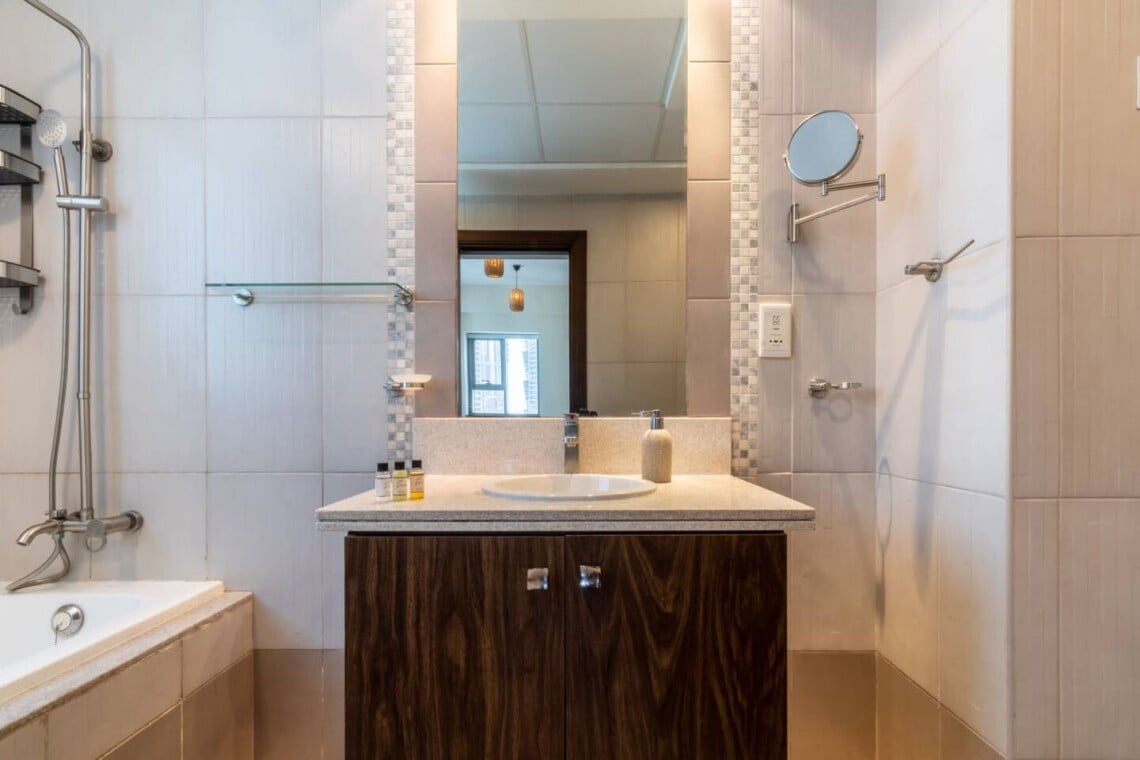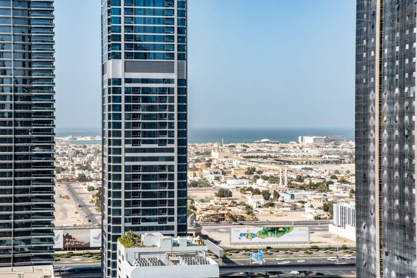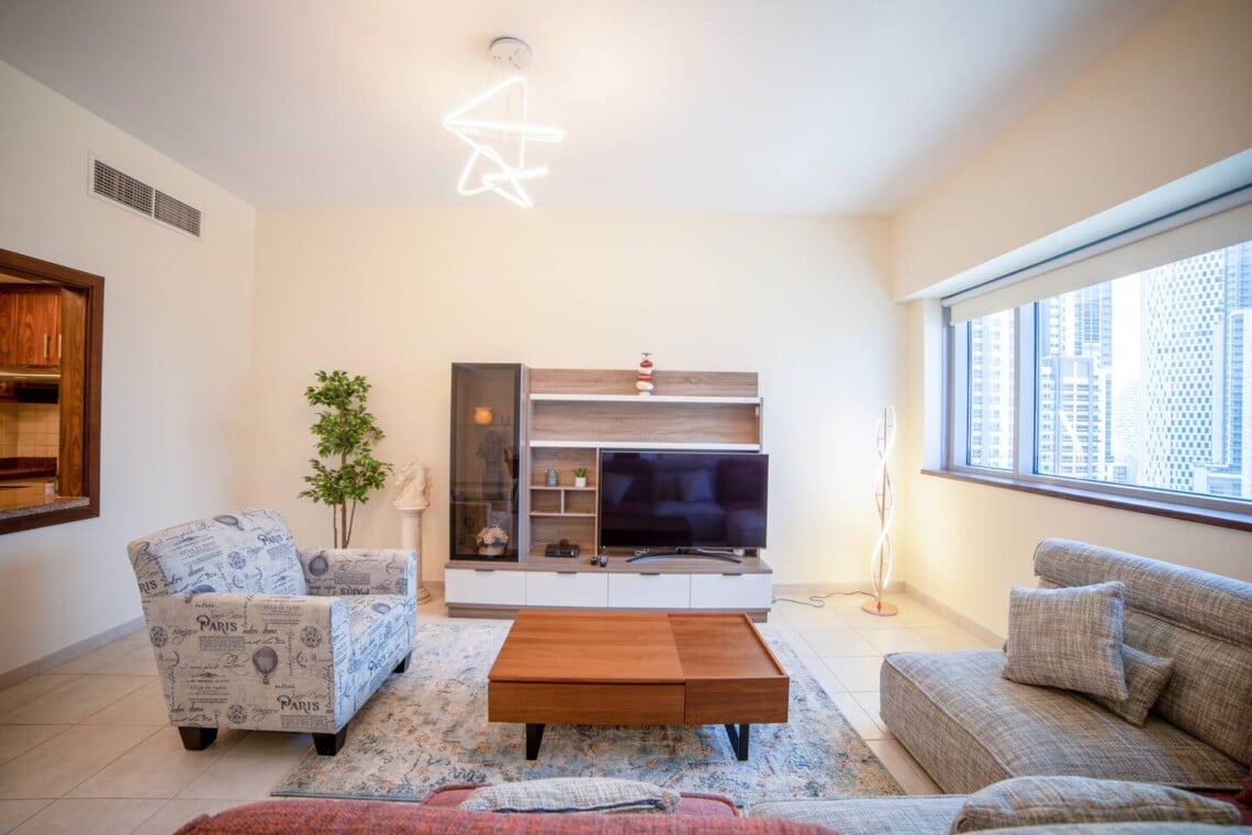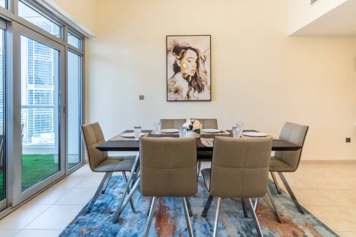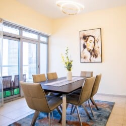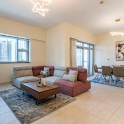 Welcome to our elegantly designed 2-bedroom, 2.5-bathroom apartment in Dubai, ideal for up to 4 guests. The apartment is fully air-conditioned, offering high-speed Wi-Fi (500Mbps) and HD TV. Enjoy a fully equipped kitchen, a cozy lounge, and a sun-soaked balcony with seating. 𝑩𝑬𝑫𝑹𝑶𝑶𝑴𝑺 This inviting residence boasts two spacious bedrooms. Both bedrooms are spacious, with high-quality linens and ensuite bathrooms. - Master Bedroom: One King Bed - Bedroom #2: One King Bed 𝘽𝘼𝙏𝙃𝙍𝙊𝙊𝙈 Two full bathrooms with bathtub-shower combos, plus a powder room. Complimentary amenities, including towels, shampoo, soap, and a hair dryer, add a touch of comfort to your stay. 𝑲𝑰𝑻𝑪𝑯𝑬𝑵 𝑨𝑵𝑫 𝑫𝑰𝑵𝑰𝑵𝑮 Fully equipped kitchen with modern appliances, including a refrigerator, stove, dishwasher, coffee facilities and more. We also have a sunlit dining area with a 6-seater table. Other amenities like the washing machine and ironing facilities are also provided for our guests which is great for short- and long-term stays. 𝑳𝑶𝑼𝑵𝑮𝑬 Feel free to relax in the open space designed living area, sit back, and enjoy this comfortable setting with a sofa, pillows, coffee table, and a flat-screen TV. Start your morning with coffee on the balcony, overlooking Dubai's vibrant views. This apartment is your perfect home away from home, combining comfort and luxury in the heart of Dubai. Whether you're here for a short getaway or an extended stay, everything you need is at your fingertips.Details