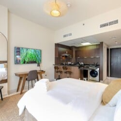 Welcome to your luxurious getaway in Dubai Sports City! This spacious studio apartment is designed to provide an unforgettable holiday experience. The abundance of natural light streaming through large windows, combined with stunning views of the golf course, creates a tranquil and inviting atmosphere for relaxation. Rest comfortably on a plush king-sized bed, and take advantage of the fully equipped kitchen with modern appliances, perfect for preparing meals and enjoying quality time with family in the ample dining area. With shopping, sports facilities, and various attractions nearby, this apartment is an ideal base for both leisure and business travelers. Comfortable Accommodation: This studio apartment boasts a spacious layout that maximizes comfort and functionality. The king-sized bed ensures a restful night’s sleep, while the full bathroom features a luxurious soaking bathtub along with a separate shower, sink, toilet, and mirror. You'll find everything you need for a home away from home, making it perfect for both short and extended stays. Interior Feeling: The apartment's interior design seamlessly blends elegance and comfort. The open-plan kitchen area allows you to engage with your family and friends while cooking. Essential cooking supplies are readily available, equipping you to create meals that satisfy your cravings. The dedicated working space features high-speed 500 Mbps Wi-Fi so you can stay productive, whether for business or leisure. Outdoor Bliss: Step out onto the balcony for a breath of fresh air and serene moments overlooking the picturesque golf course. The communal rooftop pool beckons for leisurely afternoons, while the sauna offers a perfect retreat for relaxation after a busy day exploring the city. Access to the gym ensures guests can maintain their fitness regime while enjoying their stay. Delightful Dining: Whether you're in the mood for a cozy meal at home or want to explore local dining options, the apartment’s amenities provide the perfect balance. You can whip up delicious dishes in the open kitchen and enjoy them in the inviting dining area. If you're eager to venture out, numerous restaurants nearby such as Copper Kettle and Pulcinella are just a short walk away, appealing to every palate. Local Attractions Near Property: Situated in the heart of Dubai Sports City, it is conveniently close to vibrant entertainment venues and shopping hubs. For those who enjoy shopping, nearby destinations like Waitrose Shopping Mall and Brands for Less offer a variety of options. You'll also find local cafés and eateries like Starbucks and Wagamama within a quick drive, perfect for quick refreshments or dining out. Explore all that Dubai has to offer, just a short distance away from your temporary home. Professional Cleaning and Services: To ensure your stay is as pleasant as possible, the property comes with all basic toiletries provided as complimentary gifts. Housekeeping, laundry services, and airport transfers are also available for added convenience, although additional charges apply. My team is on call 24/7 to address any questions or requests, ensuring your stay is delightful and worry-free. For added assurance, please be aware that due to local laws, a copy of your passport is required before your arrival for registration with the Dubai Tourism Department. The apartment is registered and compliant with all regulations, and a Tourism Dirham Fee of AED 20 per night will be applicable. This luxurious studio apartment in Dubai Sports City is ready to welcome you. Book now for a rejuvenating and enjoyable escape!Transit