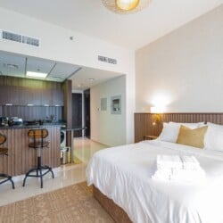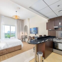 Welcome to your luxurious getaway in Dubai Sports City! - 1 spacious studio apartment with 1 King-sized bed - Stylish open-plan kitchen and dining area - Beautiful golf course view and serene balcony - Fast 500 Mbps Wi-Fi and dedicated work space - Access to gym, rooftop pool, and sauna - Nearby attractions: shopping malls, restaurants, and cafes - Complimentary toiletries and free parking on premises - Support from our team available 24/7 during your stayInteraction